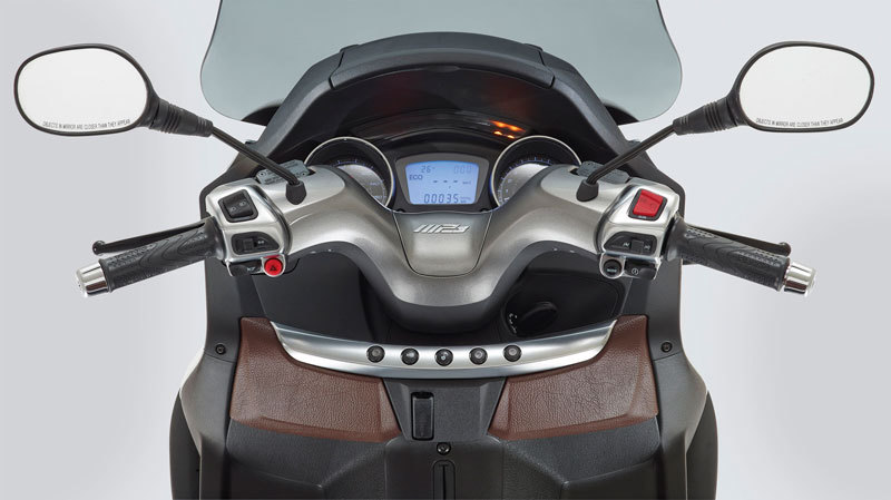 Der PIAGGIO MP3 300 ABS/ASR Business präsentiert sich in Schwarz, Weiß oder Silber und zieht mit feinster Metallic-Lackierung die Blicke auf sich. Chic, das glänzend graue Finish und die braune Sitzbank mit den doppelten Steppnähten. Edel, die Fünfspeichen-Räder.