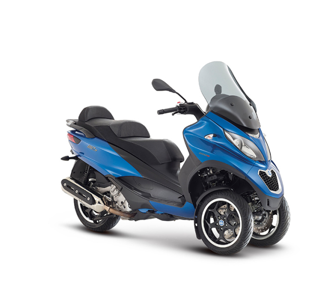 Der PIAGGIO MP3 SPORT präsentiert sich in Metallic-Blau oder Matt-Silber – oder cool in Matt-Schwarz. Glänzend, sein schwarzes Finish. Die schwarzen Leichtmetallfelgen mit polierten Kanten sind Blickfang. Ton in Ton – die schwarze Komfortsitzbank mit zweifarbiger Doppelnaht.